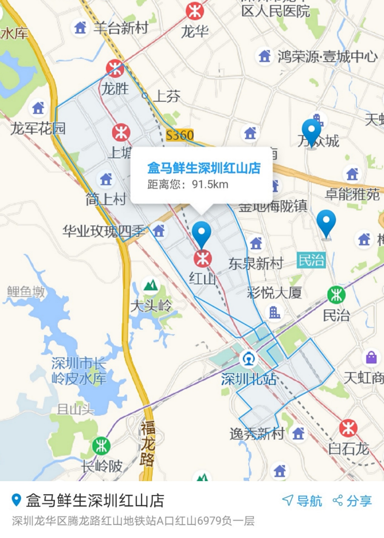 近年來,隨著深圳發(fā)展重心北拓、深圳特區(qū)一體化進(jìn)程加快,即便是在傳統(tǒng)意義上的深圳關(guān)外,在盒馬紅山店的配送范圍內(nèi),已經(jīng)有一家沃爾瑪、兩家華潤萬家等大賣場(chǎng),還有十幾家錢大媽和一個(gè)農(nóng)貿(mào)批發(fā)市場(chǎng),各類線下零售和社區(qū)買菜業(yè)態(tài)也在該區(qū)域快速發(fā)展。
