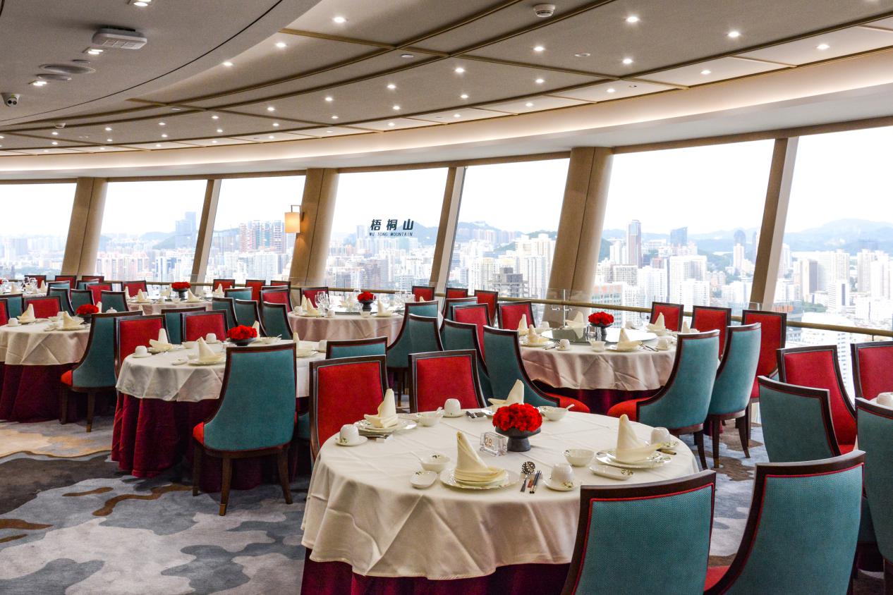 賓客置身旋轉(zhuǎn)餐廳,與香港隔海相望,深圳河、深圳灣、梧桐山、地王大廈、平安國(guó)際金融大廈等深圳美景盡收眼底,旋轉(zhuǎn)餐廳每小時(shí)轉(zhuǎn)一圈,使賓客在享受美食的同時(shí)還能360°俯瞰深圳的繁華,感受大都市的青春與活力。雖然國(guó)貿(mào)大廈不再是深圳第一高樓,但在國(guó)貿(mào)旋轉(zhuǎn)餐廳欣賞到的極具層次感的深圳景觀,是其他在大廈無法體驗(yàn)到的。因此,奠定了旋轉(zhuǎn)餐廳在深圳人心中的特殊地位。