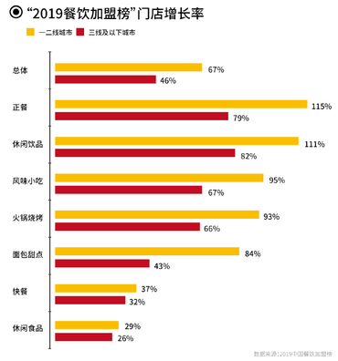 據(jù)“2019中國餐飲加盟榜”發(fā)布的數(shù)據(jù)顯示,2019年上榜的100家加盟品牌中,在一二線城市,百大上榜品牌門店數(shù)的增長率平均值為67%,顯著高于中國餐飲連鎖品牌整體增長率;在三線及以下城市,百大上榜品牌門店數(shù)的增長率平均值為46%。正餐與休閑飲品兩大品類在一二線城市城市門店數(shù)的增長率更是超過了100%。