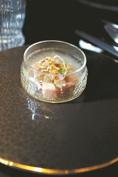 煙焯,當(dāng)廚者將眼前的玻璃罩打開時(shí),撲鼻而來的是蘋果木的煙熏香氣,閉目吸了一口氣,爾后才動(dòng)勺。先將其中的金槍魚tata與炸過的洋蔥和檸檬葉絲等輕輕攪拌,然后開吃。據(jù)主理人彪哥介紹,撈起是順德魚生的吃飯演變而來,金槍魚tata是日式元素,煙熏是西餐中常用的技法。