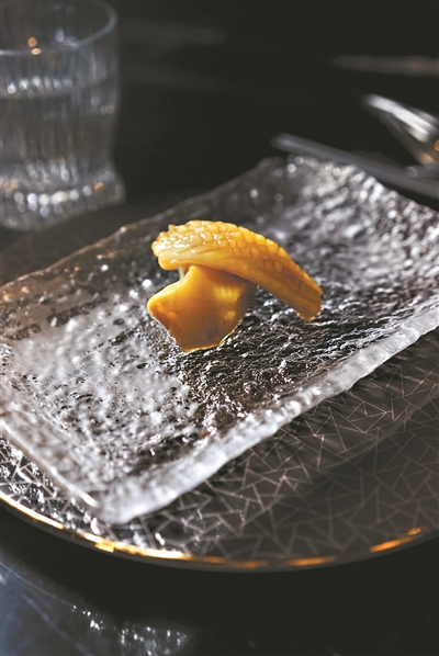 湯焯乃雞油焯響螺。1斤1只的響螺去殼與頭后,凈肉僅僅2兩。切成片狀的響螺經(jīng)過定時(shí)低溫慢煮后,淋上剛剛滾起的熱雞油,上碟時(shí),它旁邊跟著一灘其貌不揚(yáng)的醬汁,那便是紫蘇醬。響螺配紫蘇,勾起人們對(duì)中秋的紫蘇炒田螺的味覺記憶。油焯的風(fēng)味靈感源自蒜香骨這道傳統(tǒng)粵菜,取蒜香味結(jié)合魚露醬,融入花膠天婦羅之中。將花膠以天婦羅的方式展現(xiàn),這也是大膽的嘗試。味焯的做法則讓人更熟悉,立馬想起前些年風(fēng)靡廣州的鹵水火鍋來。獅頭鵝的鵝肝在鹵水里泡著溫泉,時(shí)間一到才起身,并不太咸,香濃恰好。還有汽焯,是用最當(dāng)造的大黃花魚,將整個(gè)迷你小蒸籠搬到面前來,現(xiàn)蒸現(xiàn)吃,7分鐘,嫩度正好?;痨虅t是燒烤澳大利亞和牛肉的燒烤方式,這最原始的烹飪方式里夾著迷迭香和百里香的誘人香氣。而這每一道菜肴,僅僅數(shù)口的分量,道道位上,分量恰到好處,避免了餐桌上的浪費(fèi)。
