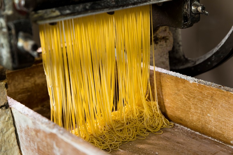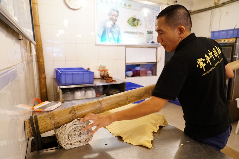 竹升面的精妙在于面味與堿水之間的平衡。堿水決定爽度,面粉決定了硬度和面香。堿水通常分3個(gè)度,19.5度、32度和52度,香港竹升面堿水通常用52度的,更為爽口,幾乎一咬即斷;斌哥用的是19.5度的堿水,表現(xiàn)的是恰到好處的爽。面粉必然要用高精面粉,但市面上的面粉那般多,要選合心水的實(shí)屬不易,他足足換了20多種,最后才選到合意的。25斤面粉,加上13斤鴨蛋,抽去蛋黃,只用蛋清,這也是增加面條爽度的法子,整個(gè)過程不加入一滴水。
