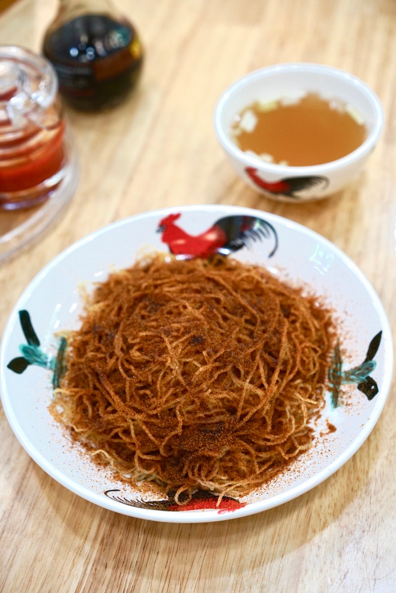 他家的云吞面同樣投注了許多的心機(jī)。湯底用厚身的油地、淡水蝦子、蝦米、金華火腿和豬骨來熬制,每天早上3點(diǎn)半開始煲,足足煲上3個(gè)小時(shí)。他認(rèn)為如今的雞蛋香味并不遜色于鴨蛋,因此在做面時(shí),他用的是雞蛋,蛋清與蛋黃都用上。蛋清增加面的硬度,蛋黃帶來香度。面條同樣用高筋面,面所用的堿水,是有著上百年歷史的陳村食用堿水,爽中帶麥香,這是嚴(yán)格把控走堿時(shí)間的“成果”。至于云吞,吳錦云有自己的理解,不加鮮蝦,只用豬的上胛肉。手工處理,挑除上胛肉的筋與網(wǎng)油,最后的成率只有六七成。豬肉全部經(jīng)過手工切,一粒粒肥瘦均勻。薄薄的云吞皮,裹著精制過的豬肉,小巧玲瓏,肉香皮薄。
