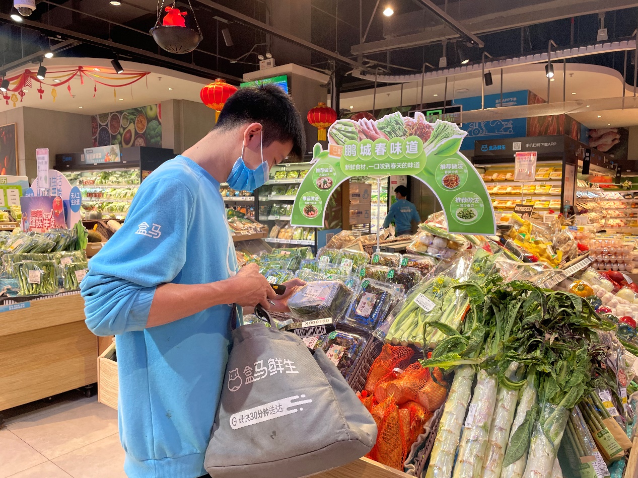 消費者通過手機下單購買春菜,盒馬小二正在揀貨