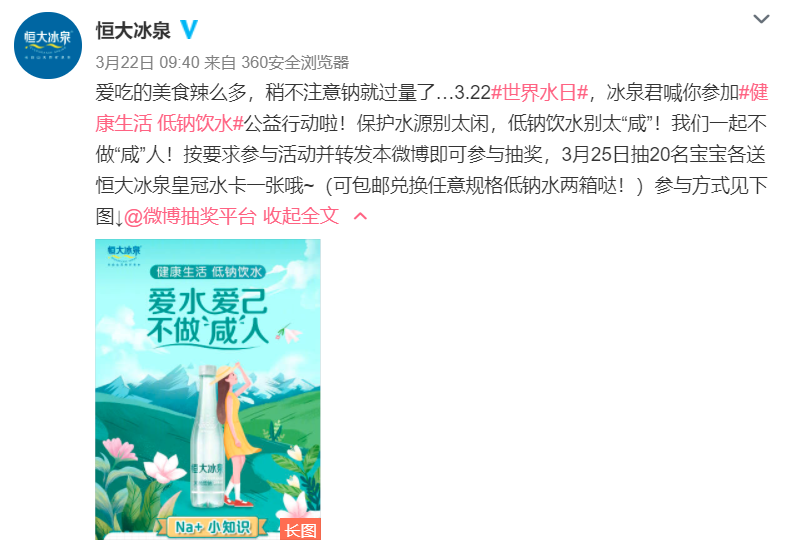 見(jiàn)圳客戶(hù)端·深圳新聞網(wǎng)2021年3月30日訊 (記者 常軍平)目前正值3月22日第二十九屆“世界水日”以及3月22—28日第三十四屆“中國(guó)水周”之際,恒大冰泉天然低鈉礦泉水深入洞察借勢(shì),發(fā)起以不做“咸”人為主題的公益活動(dòng),引發(fā)了全網(wǎng)的關(guān)注熱議和積極參與,刷屏社交媒體,成為新的公益“爆款”。
