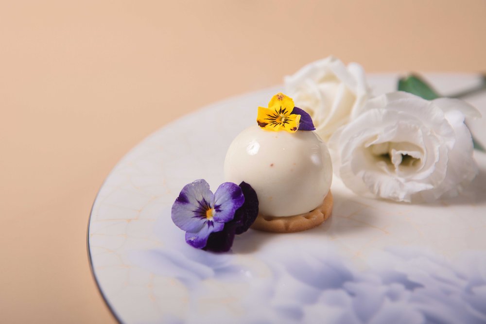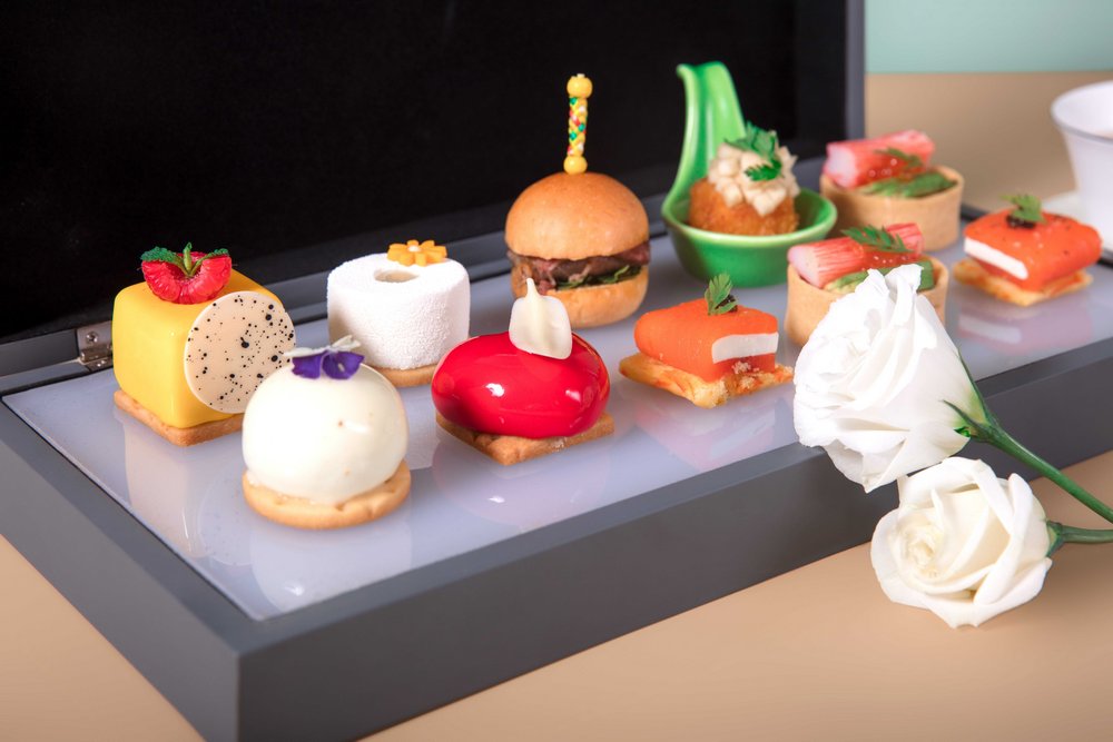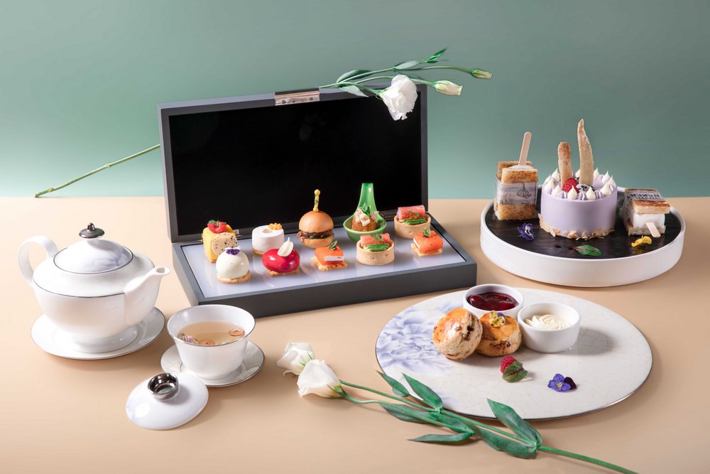 酒店餅房廚師長(zhǎng)趙偉融匯創(chuàng)新,選用當(dāng)季新鮮花材與鮮爽水果,打造了數(shù)款意趣多彩的甜品佳作:茉莉百香果椰子蛋糕,茉莉花的清新邂逅酸甜的百香果與香濃的椰子,細(xì)品層疊交融的奇妙滋味;洛神花玫瑰蛋糕,玫瑰的馥郁悠長(zhǎng)糅合洛神花的明快艷麗,一口便是春天;青檸春茶蛋糕,別具創(chuàng)意地將青檸和碧螺春茶融合,酸爽口感里裹挾著若隱若無的茶香;桂花米酒蛋糕,當(dāng)桂花飄進(jìn)米酒,花香伴著微醺,細(xì)膩綿柔,在唇齒間琢磨品味;水果“炸彈”,輕輕一敲,冰爽可口的水果傾瀉而出,果香四溢,是視覺和味覺的盛宴。咸點(diǎn)也是不可錯(cuò)過的味蕾禮賞:肉質(zhì)鮮嫩的蟹肉和清新爽口的牛油果巧妙融合,呈現(xiàn)海陸鮮甜交匯的美妙體驗(yàn);細(xì)膩鮮美的三文魚,配上絲滑濃郁的奶油芝士和誘人的魚子醬,是一場(chǎng)舌尖的奢享。隨下午茶搭配的新鮮烘焙司康餅,花香果香四溢的花茶,更增添午后的曼妙意趣。