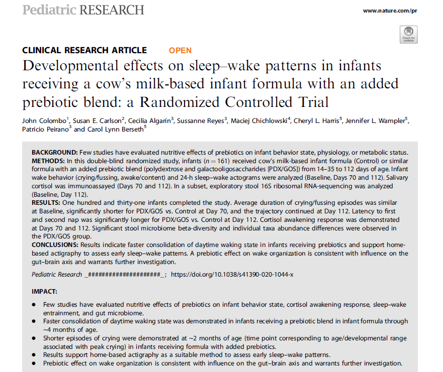 近日,一篇臨床研究揭示了寶寶腸道營養(yǎng)與睡眠間的關(guān)聯(lián)。據(jù)悉,這項研究于2014年啟動,是全球首個探究 PDX+GOS益生元組合配方奶粉與寶寶睡眠模式養(yǎng)成關(guān)系的雙盲隨機(jī)對照試驗。研究由美國堪薩斯大學(xué)壽命研究所John Colombo教授牽頭,美國堪薩斯大學(xué)醫(yī)學(xué)中心營養(yǎng)學(xué)系、智利大學(xué)營養(yǎng)與食品技術(shù)研究所睡眠與功能性神經(jīng)生物學(xué)實(shí)驗室等多個國際知名研究機(jī)構(gòu)共同參與。這項研究在經(jīng)研究同行的層層學(xué)術(shù)審評后,近日于《兒科研究》上正式發(fā)表,成果獲得科學(xué)界認(rèn)可。
