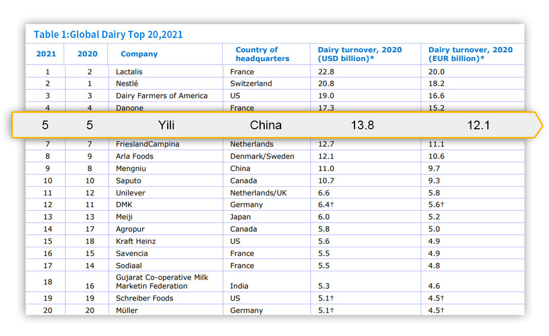 伊利蟬聯全球乳業(yè)五強、連續(xù)8年穩(wěn)居亞洲乳業(yè)第一