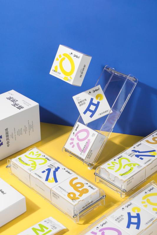 作為和Seesaw聯(lián)名的禮盒,為了增加互動(dòng)感和cp感,喜茶將“偷顆月亮送給你”的主題在外包裝設(shè)計(jì)上加以延展,設(shè)定了“互偷月亮”的概念,將靈感注入外包裝設(shè)計(jì)中以圖形上的方圓結(jié)合、顏色上的簡約和諧,以及喜茶和Seesaw特有元素的交相呼應(yīng),為消費(fèi)者帶來兼具互動(dòng)性、包容性的視覺體驗(yàn)。方圓的簡約圖形結(jié)合馬克筆筆跡式的設(shè)計(jì)元素,給人以想象空間。同時(shí),結(jié)合代表“夜晚”的“藍(lán)色”和代表“月亮”的“黃色”這兩種顏色系統(tǒng)的運(yùn)用,進(jìn)一步對(duì)主題加以呈現(xiàn)。禮盒整體上則突破傳統(tǒng)的橫放型禮盒式樣,采用直立型包裝,令人耳目一新。每一處設(shè)計(jì),都延續(xù)了喜茶靈感。