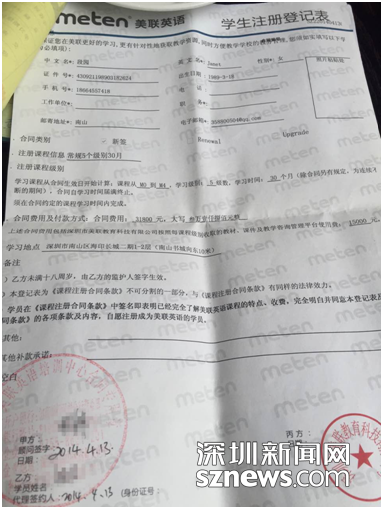 段女士告訴記者,2014年她在網(wǎng)上與美聯(lián)英語(yǔ)的客服人員取得聯(lián)系后,便前往南山區(qū)海印長(zhǎng)城二期1-2層的美聯(lián)英語(yǔ)中心試聽(tīng)課程,并于當(dāng)年4月報(bào)讀了M0—M4五個(gè)級(jí)別共31800元的課程。段女士當(dāng)時(shí)選擇的是分期付款方式,在完成首付3200元后,其余的金額由銀行每月自動(dòng)扣除1100余元。截至目前,段女士已連續(xù)繳費(fèi)22個(gè)月。