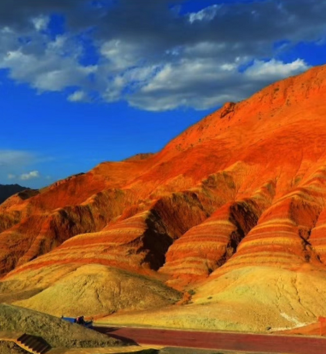 夜宿張掖丹霞公園,早晚之景,分外別致,既有朝陽晚霞的映襯,也有山貌土質(zhì)的特性,構(gòu)筑成一幅幅天地合一的壯麗畫面,于是,我又寫下來“猜2”——-丹陽裸照山土紅,晚霞斜映溝丘重,七色帶環(huán)競爭艷,彩云作被情更濃!此又何處?