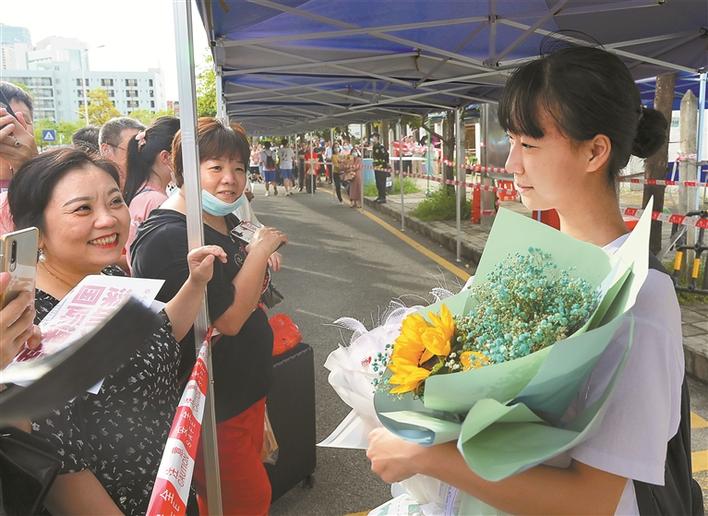 家長帶著鮮花來到寶安中學(xué)考場門口迎接考生。深圳商報記者陳錫明攝