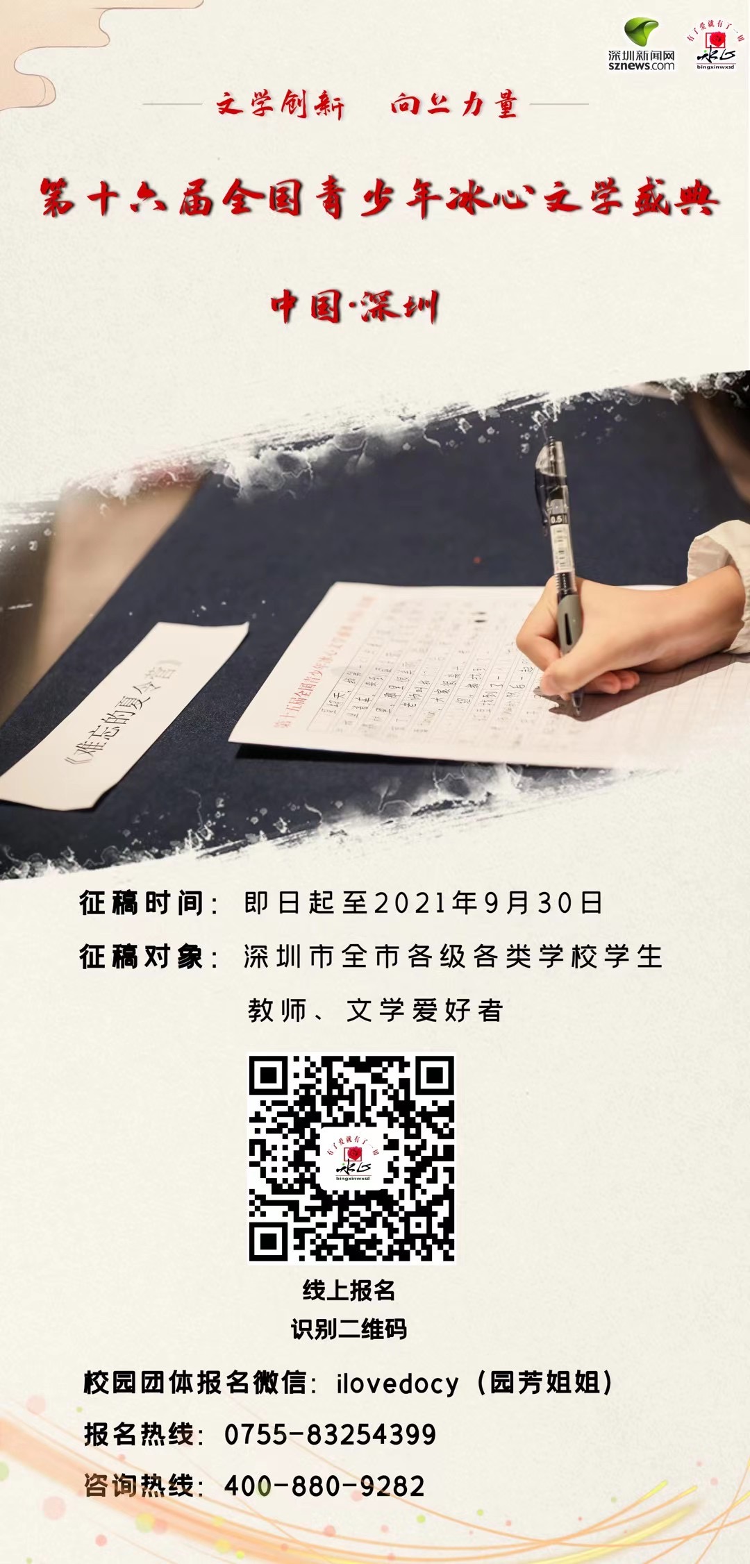 見(jiàn)圳客戶端·深圳新聞網(wǎng)2021年3月2日訊 為繼承和發(fā)揚(yáng)中華文化及冰心文學(xué)精神,促進(jìn)中華文化、中國(guó)現(xiàn)代化文學(xué)史更深入地植入深圳下一代青少年心中,奠定堅(jiān)實(shí)的中國(guó)社會(huì)主義現(xiàn)代化建設(shè)根基,2021年“第十六屆全國(guó)青少年冰心文學(xué)盛典中國(guó)·深圳”正在愛(ài)好文學(xué)的師生學(xué)友們之間熱烈展開(kāi)。