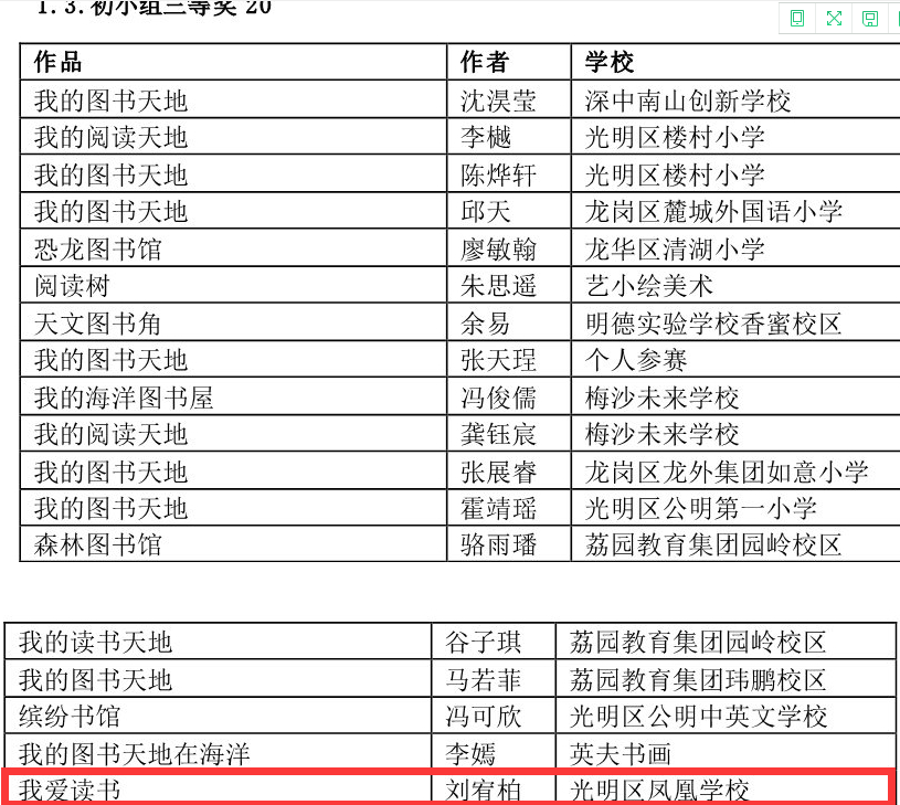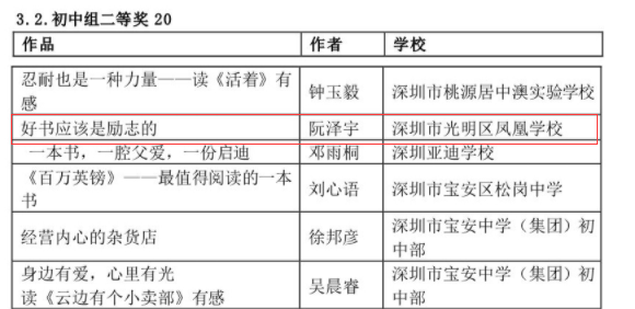 在深圳市4·23世界讀書(shū)日“探索閱讀新領(lǐng)域”創(chuàng)作比賽中學(xué)校榮獲優(yōu)秀組織獎(jiǎng),何雨晴、劉宥伯同學(xué)分別獲初小組二等獎(jiǎng)、三等獎(jiǎng);阮澤宇、張雪怡同學(xué)分別榮獲初中組二等獎(jiǎng)、三等獎(jiǎng)。郭瑞芳老師榮獲優(yōu)秀指導(dǎo)老師獎(jiǎng),曾嵽稜、賴(lài)美君、李海亮榮獲優(yōu)秀組織老師獎(jiǎng)。