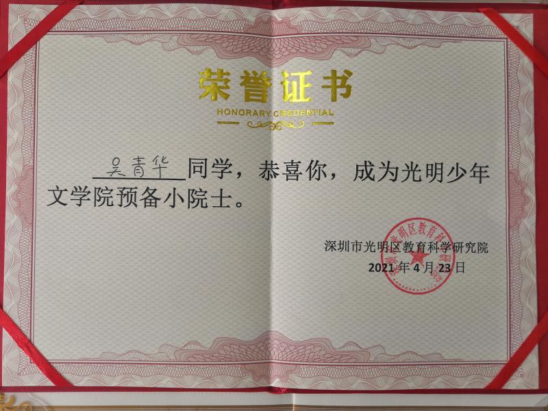 在光明區(qū)少年文學(xué)院評(píng)選中,學(xué)校獲批成立“光明區(qū)少年文學(xué)院分院”,陳沐文老師擔(dān)任文學(xué)院期刊編輯,方汶琪、劉梓萌、吳青華三位同學(xué)被授予“預(yù)備小院士”稱(chēng)號(hào)。