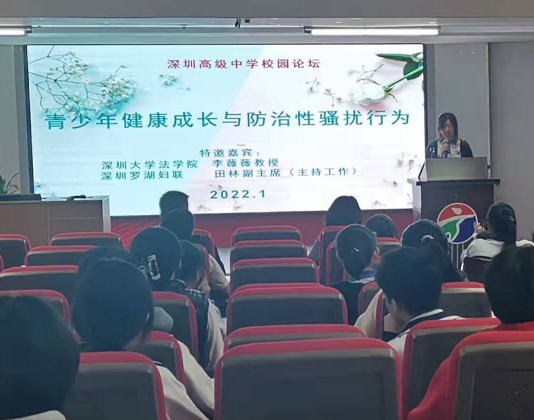 讀特客戶端·深圳新聞網(wǎng)2022年1月8日訊(記者 陳彬)為進(jìn)一步加強(qiáng)校園性騷擾防治,推動(dòng)深圳在“法治城市示范”建設(shè)工作上先行示范,1月8日,深圳市高級(jí)中學(xué)舉辦“青少年健康成長(zhǎng)與防治性騷擾行為”主題論壇,邀請(qǐng)深圳市羅湖區(qū)婦聯(lián)副主席田林、深圳大學(xué)法學(xué)院李薇薇教授、深圳市高級(jí)中學(xué)學(xué)生代表吳雅涵同學(xué)擔(dān)任主講,深圳市高級(jí)中學(xué)國(guó)際部高年級(jí)同學(xué)到場(chǎng)聆聽。