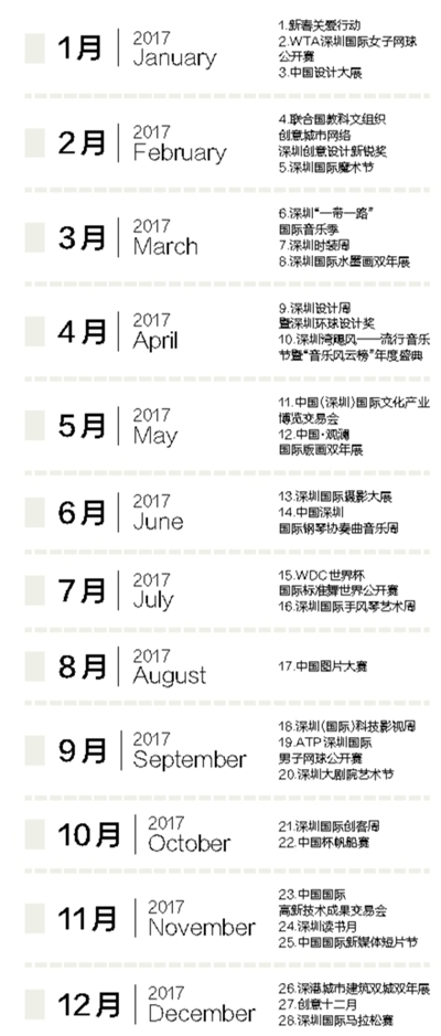 往細里說,“城市文化菜單”呈現(xiàn)出鮮明亮點:一是國際化程度高。大部分活動都有國際權(quán)威和國家級專業(yè)機構(gòu)主辦或授權(quán)支持,不少活動代表了我國這一領(lǐng)域的最高水準,是可以代表深圳國際化城市形象的“文化大餐”。二是內(nèi)容豐富多彩。這份“菜單”表面上看只有28項,實際上每項活動時間跨度從幾天到一個多月不等,由十?dāng)?shù)項甚至上百項活動組成,各款“菜式”都有,不同口味的人都可以自行“看單點菜”。三是體現(xiàn)深圳特色。“菜單”中有三分之一的活動與創(chuàng)新創(chuàng)意有關(guān),正好體現(xiàn)了深圳“創(chuàng)新之城”、“設(shè)計之都”的城市特性,可謂是深圳的文化“特產(chǎn)”。四是新的品牌活動首次集體亮相。經(jīng)過多年培育,深圳已經(jīng)擁有文博會、高交會、讀書月、創(chuàng)意12月等傳統(tǒng)品牌活動,接下來還要精心打造一系列新的文化品牌活動。在這份“菜單”中,2016年及今年新創(chuàng)辦的就有深圳“一帶一路”國際音樂季、深圳國際科技影視周、深圳國際攝影大展、深圳設(shè)計周、中國圖片大賽等多項活動,文博會、新春關(guān)愛行動、國際魔術(shù)節(jié)等老牌活動也都將有新的策劃、新的提升,更具國際化內(nèi)涵。一句話,這份菜單共匯集了國際化、標志性的品牌文化活動28項,涵蓋文化藝術(shù)、創(chuàng)意設(shè)計、科技創(chuàng)新、體育休閑等多個類別,是廣義的文化活動的概念。