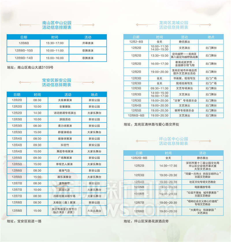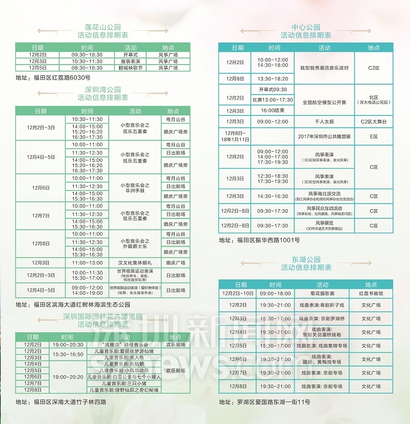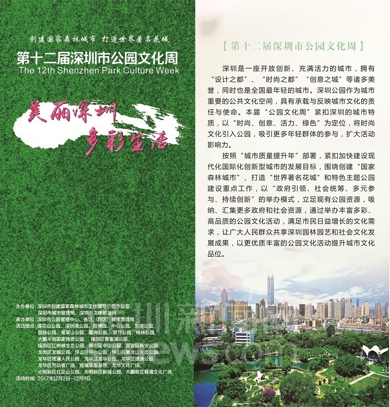 深圳新聞網(wǎng)12月1日訊(記者 鐘鴻冰 通訊員 崔嵩)一年一度的公園文化節(jié)即將到來,12月2日-12月8日,2017年第十二屆公園文化周將在全市27家公園舉行。本屆公園文化周緊密結合創(chuàng)建“國家森林城市”和打造“世界著名花城”重點工作,以“美麗深圳 多彩生活”為主題,充分展現(xiàn)美麗宜居的城市環(huán)境及豐富多彩的城市文化生活。
