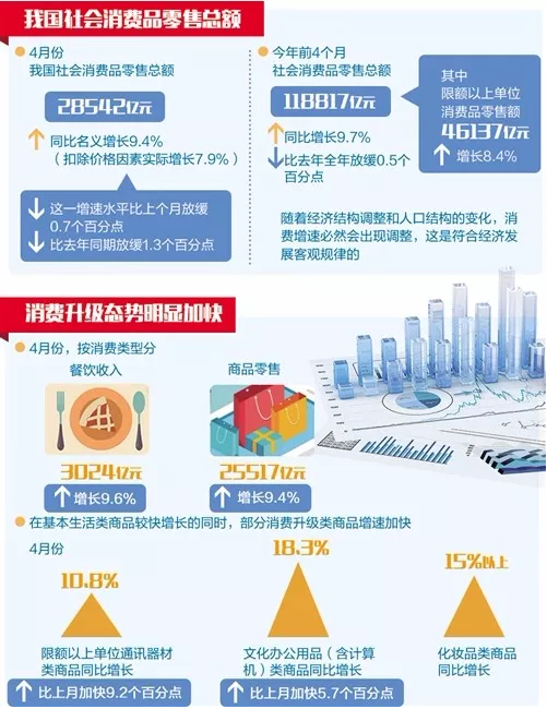 今年前4個(gè)月,社會(huì)消費(fèi)品零售總額118817億元,同比增長(zhǎng)9.7%,比去年全年放緩0.5個(gè)百分點(diǎn)。其中,限額以上單位消費(fèi)品零售額46137億元,增長(zhǎng)8.4%。
