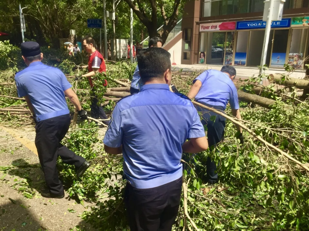 9月19日上午,福田區(qū)百花二路、三路,60多名身著藍(lán)色制服的警察和紅色馬甲的輔警格外顯眼,他們正在揮汗如雨地進(jìn)行災(zāi)后路障清理工作。