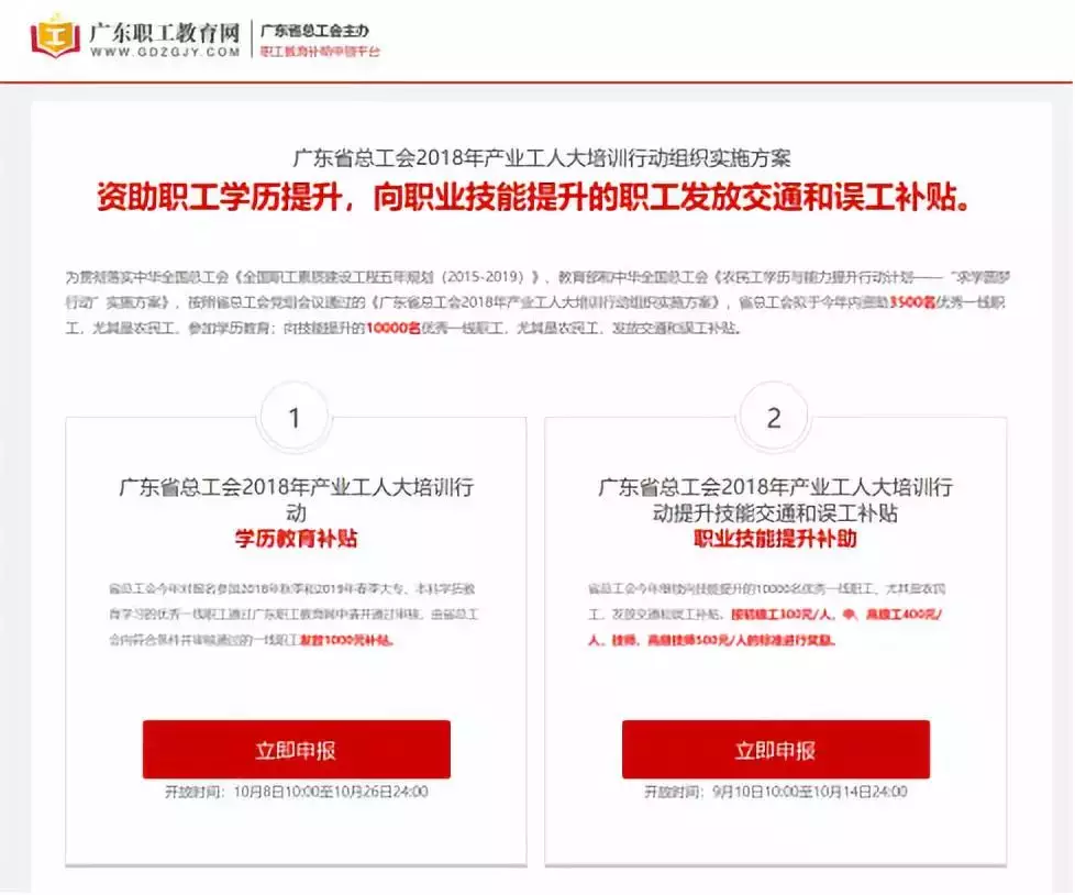 在網(wǎng)站(www.gdzgjy.com)首頁左側(cè)【申報與補貼申領入口】,點擊“廣東省總工會產(chǎn)業(yè)工人大培訓學歷、職業(yè)補貼申領”界面,選擇右側(cè)“職業(yè)技能提升補助”點擊【進入申領】。