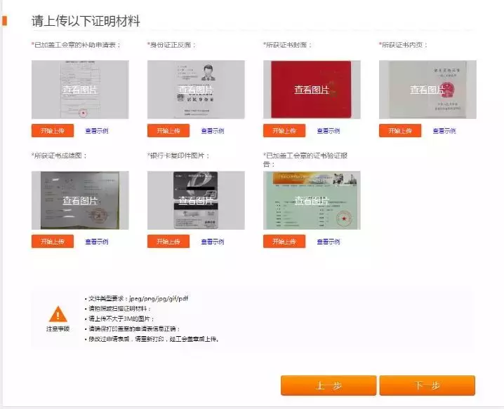 3.進入證明資料上傳頁面,將準備好的資料進行上傳,全部上傳完后,點擊【下一步完成提交】;