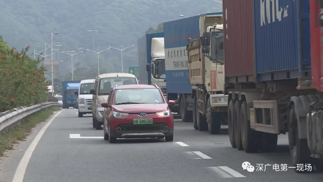 從梅觀路進(jìn)梅林關(guān)往西方向,轉(zhuǎn)南坪快速路的輔道,是一條對(duì)貨車開放的路段。本來出口有兩條車道,而最近這兩車道變成了單車道,導(dǎo)致路況十分擁堵。