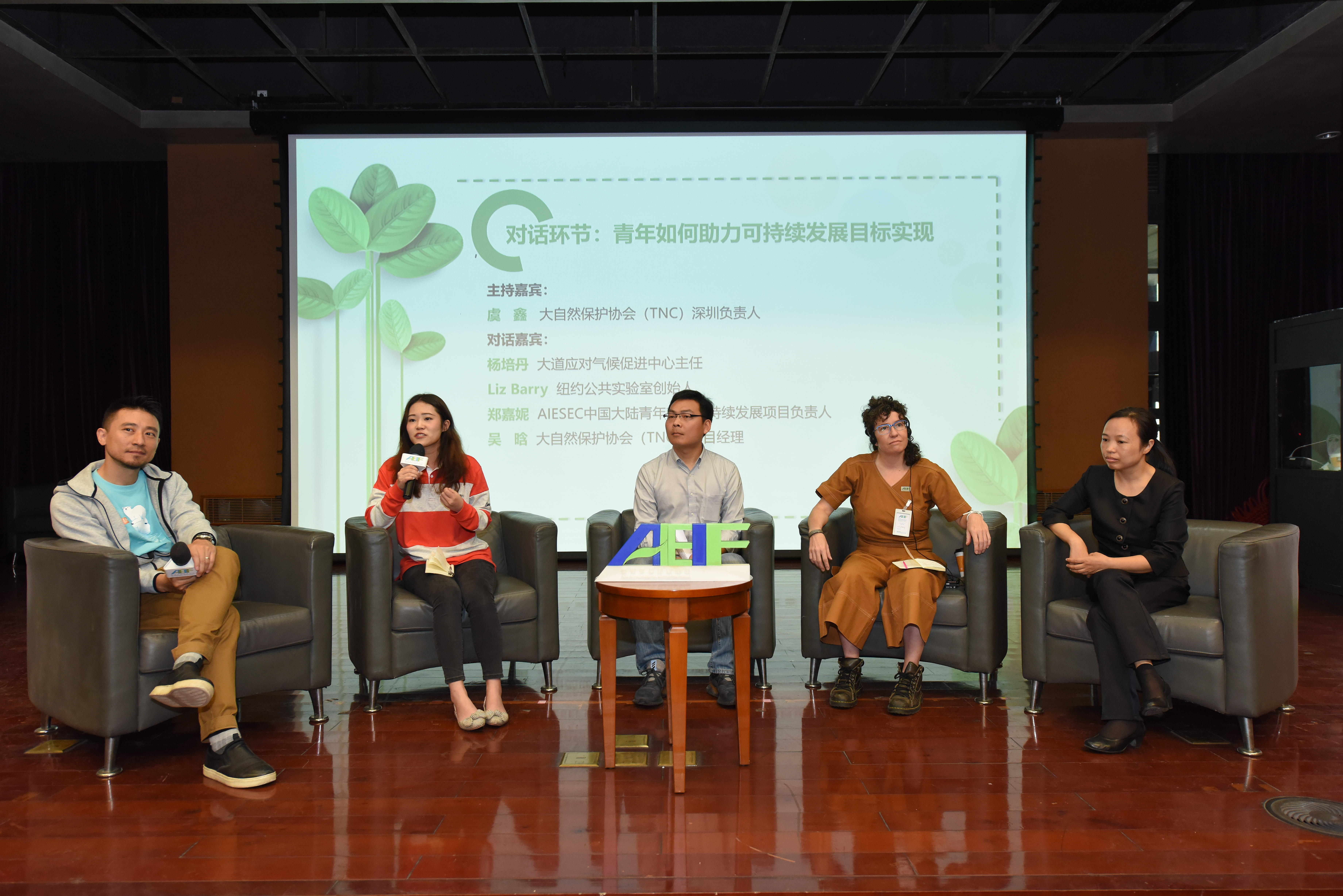 對話環(huán)節(jié)“青年如何助力可持續(xù)發(fā)展目標(biāo)實現(xiàn)”共有6位嘉賓參與。在主持嘉賓大自然保護(hù)協(xié)會(TNC)深圳保護(hù)項目負(fù)責(zé)人虞鑫先生的帶領(lǐng)下,大道應(yīng)對氣侯促進(jìn)中心主任楊培丹、紐約公共實驗室創(chuàng)始人Liz Barry、AIESEC中國大陸青年獻(xiàn)力可持續(xù)發(fā)展項目負(fù)責(zé)人鄭嘉妮、大自然保護(hù)協(xié)會(TNC)項目經(jīng)理吳晗參與了分享交流。