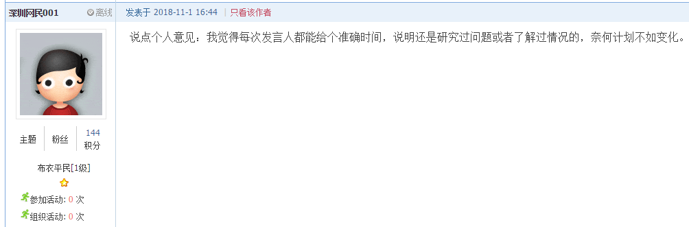縱觀該帖文,網(wǎng)友將2017年以來(lái)的文字截圖一一呈現(xiàn),“有圖有真相”的質(zhì)疑羅湖區(qū)相關(guān)政府部門(mén)。但,就如上圖網(wǎng)友所言,不管面對(duì)何事,都應(yīng)當(dāng)讓“理解”先行。只是當(dāng)市民給予了一定理解之后,也希望相關(guān)部門(mén)信守承諾,盡量避免屢次爽約,畢竟政府部門(mén)的信用是靠其一言一 行來(lái)建立的。