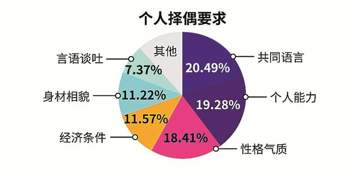 調(diào)查顯示,共同語言、個人能力、性格氣質(zhì)為單身男女在擇偶時最看重的三個方面,其次為經(jīng)濟條件、身材相貌、言語談吐??梢姡噍^于過去條件上的匹配,更重視精神上的契合。