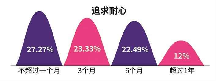 在追求耐心方面,有超七成單身男女追求愛情的時間不超過半年,其中27.27%的單身表示對喜歡的人追求時間不超過一個月,23.33%的人追求時間為3個月,另外有22.49%愿意追求時間為6個月,僅有12%的單身男女追求喜歡的人愿意超過1年。