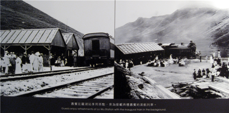 左圖為參加通車典禮的中英嘉賓在羅湖車站享用茶點。右圖為首航列車通過時的場景