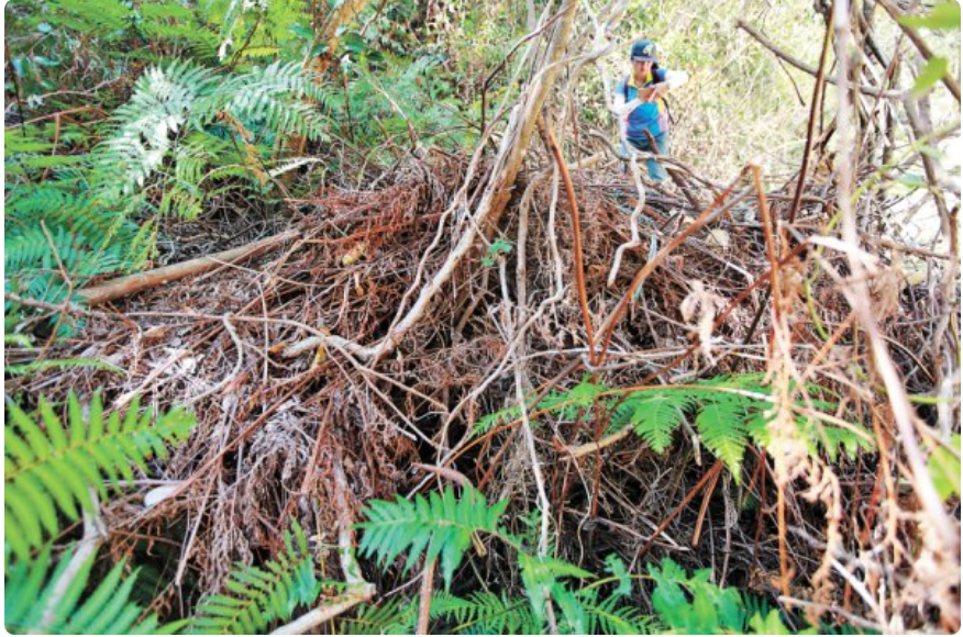 山谷中一個(gè)長(zhǎng)約50米、寬約30米的采石現(xiàn)場(chǎng)赫然出現(xiàn)在眼前。大量碎石被整齊碼放在山坡上,在溪水流經(jīng)的兩塊巨石上,散落著幾根鋼筋撬棍、幾把小鐵錘,還有一些塑料刷子和手套。在現(xiàn)場(chǎng)西側(cè)的一片小樹林下,堆放著十幾根被鋸斷的樹干,走近一看,樹干里放著鋼鋸等工具。在樹干上方,則是一堆用塑料繩捆扎好的、已經(jīng)枯黃的藤類和蕨類植物,經(jīng)辨認(rèn),這里有相當(dāng)一部分是國(guó)家二級(jí)保護(hù)植物"金毛狗"。此外,在采石現(xiàn)場(chǎng)北側(cè),可以看到一些還沒有被挖掉的蕨類植物,這些則是幸免于難的殘存"金毛狗"。