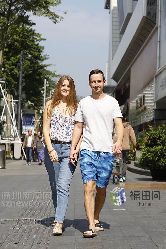 俄羅斯情侶身穿背心牛仔褲與短袖短褲,明亮的藍(lán)色依然是夏天的感覺(jué)。