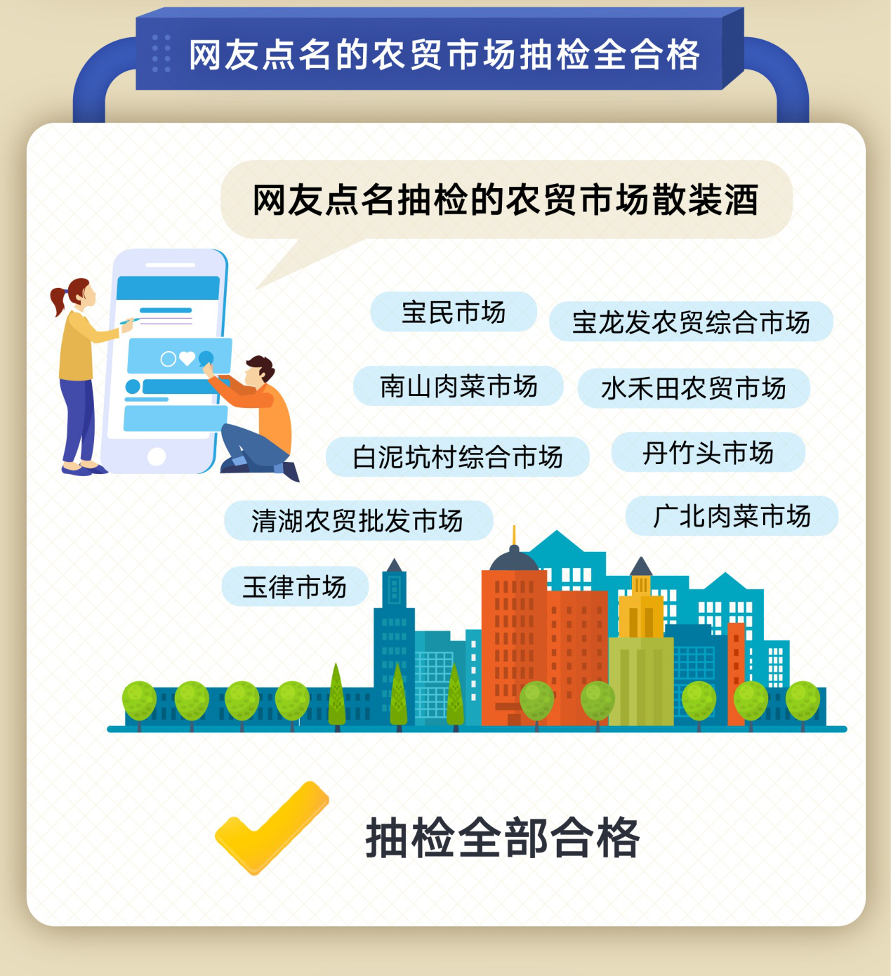 另外,根據(jù)網(wǎng)友點名,抽檢了這些農(nóng)貿(mào)市場的商行散裝酒:寶民市場、寶龍發(fā)農(nóng)貿(mào)綜合市場、南山肉菜市場、水禾田農(nóng)貿(mào)市場、白泥坑村綜合市場、丹竹頭市場、廣北肉菜市場、清湖農(nóng)貿(mào)批發(fā)市場、玉律市場等,全部合格。