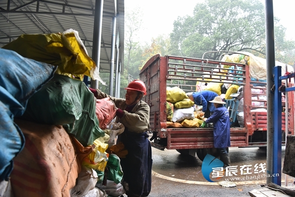 (白箬鋪鎮(zhèn)分揀回收總站的工作人員正對村里轉(zhuǎn)運來的垃圾進(jìn)行分類。)