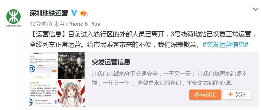 而據(jù)@深圳地鐵運營19點44分消息稱,3號線荷坳站已恢復正常運營,全線列車正常運營。
