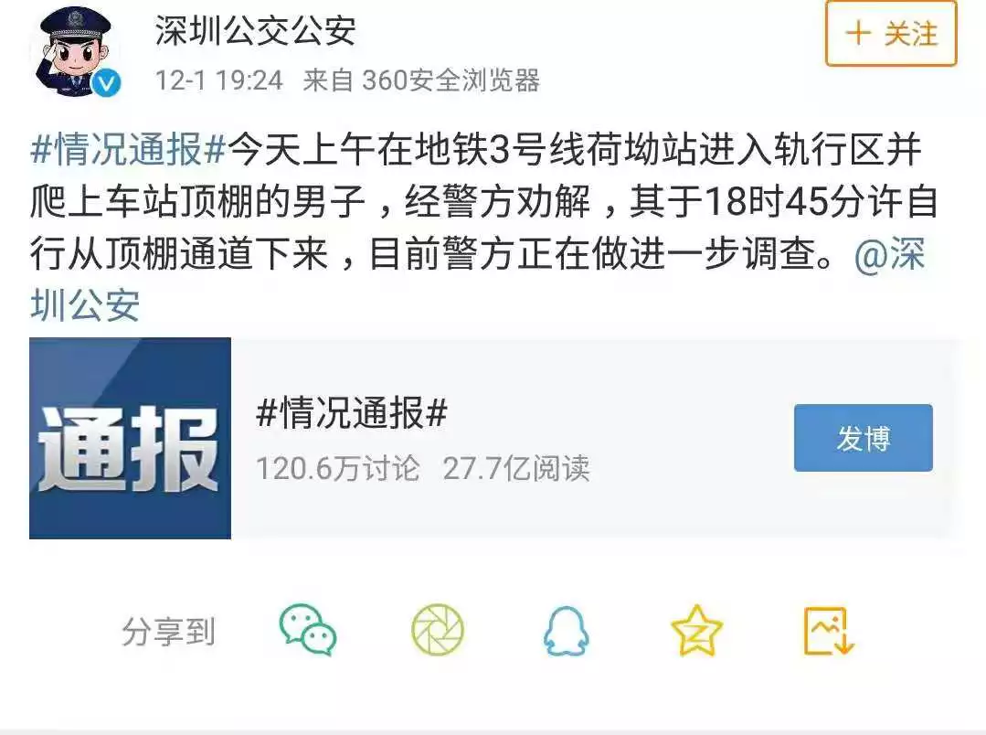 @深圳公交公安19點24分發(fā)布的消息,經(jīng)過深圳警方的勸解,男子自行從頂棚通道下來,目前警方正在做進一步調(diào)查。