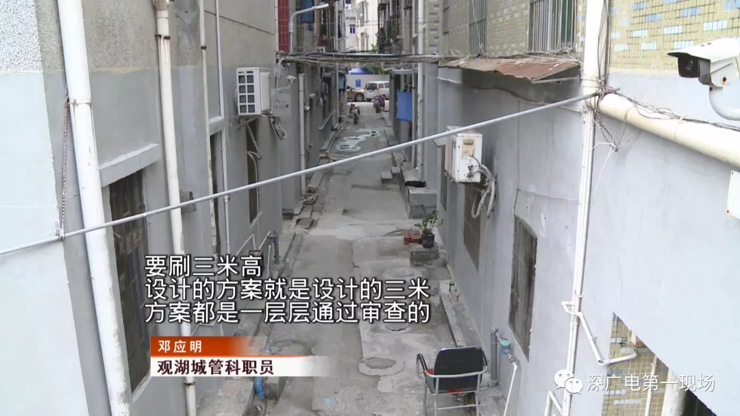 這里是龍華區(qū)觀(guān)湖街道辦福樓村里的城中村,這些居民樓的小巷子里,在這兩天來(lái),有不少施工人員正在這里粉刷外墻。現(xiàn)場(chǎng)施工人員說(shuō),他們只刷房子的底下一層。