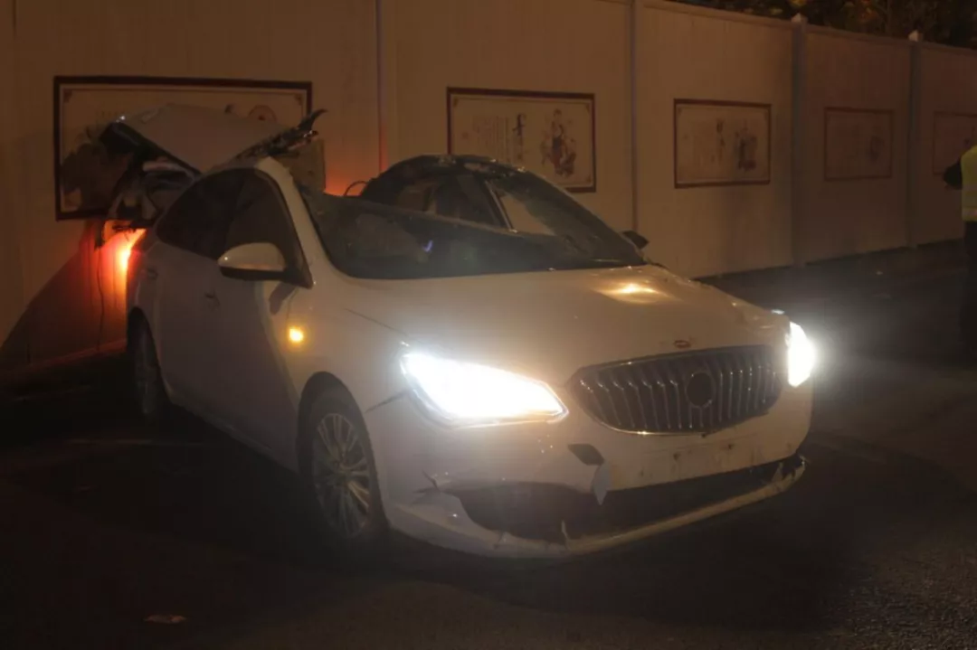 白色轎車車頭被“削頂”。