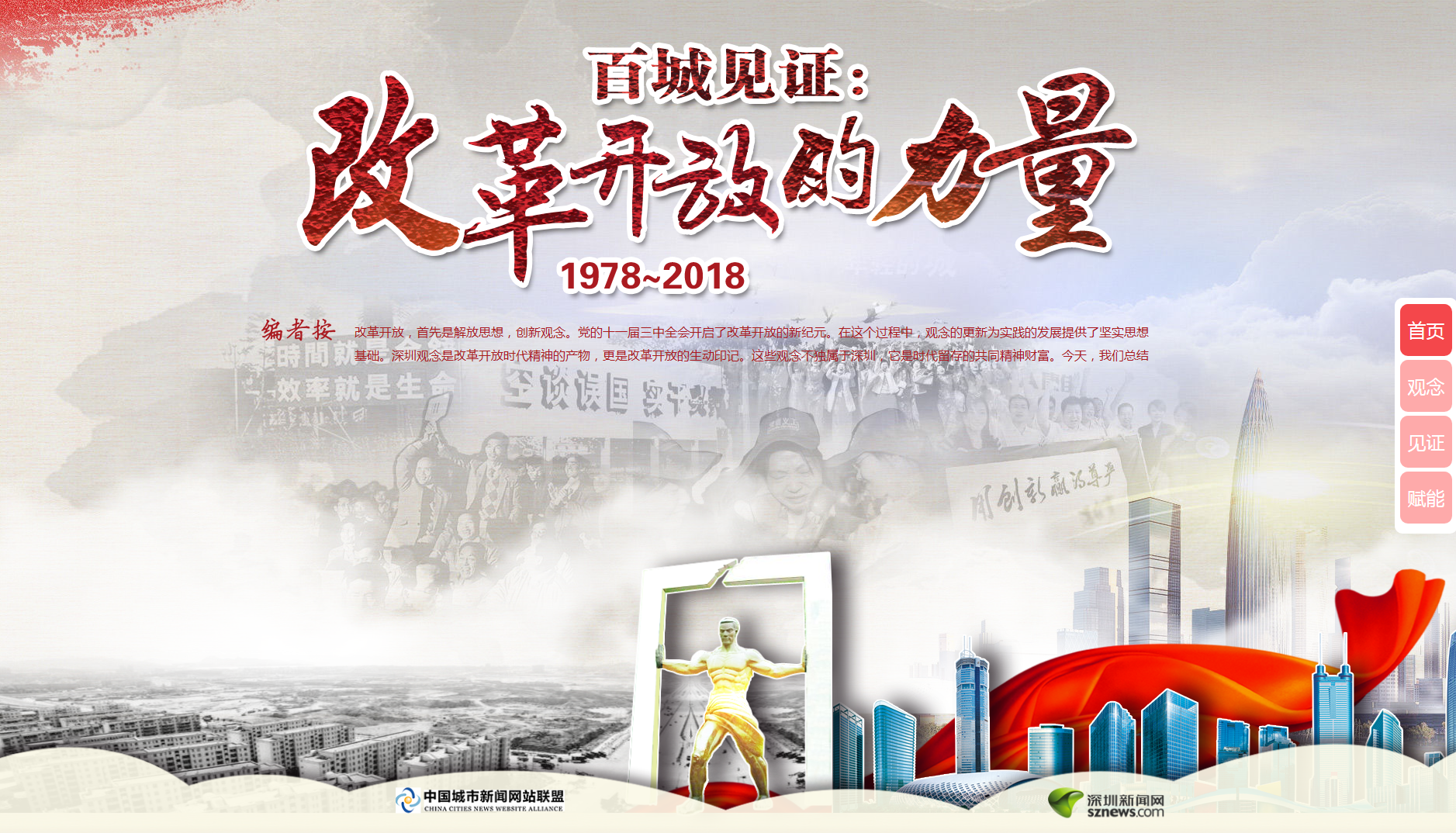此次活動由中國城市新聞網(wǎng)站聯(lián)盟主辦,深圳新聞網(wǎng)承辦,活動在今年10月中國城市新聞網(wǎng)站聯(lián)盟總編輯聯(lián)席會上正式啟動。專題網(wǎng)頁采用全新H5技術(shù),用歷史原圖、視頻、音頻和文字交互呈現(xiàn)方式,詮釋改革、實干、擔當、文明、開放、創(chuàng)新等深入民心的改革開放觀念,并發(fā)動網(wǎng)盟近百家成員單位網(wǎng)站,深入挖掘當?shù)爻鞘懈母镩_放的生動案例和故事,報道這些代表性觀念對所在城市發(fā)展的巨大影響,共同描繪改革開放40年的生動畫卷。