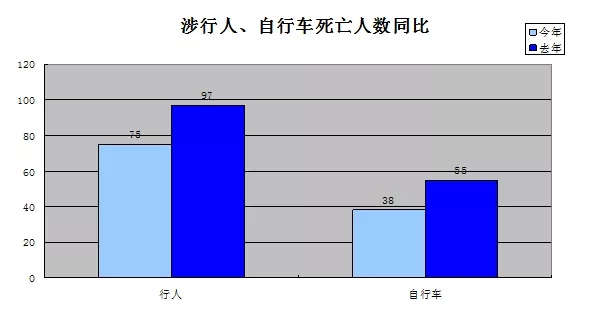 今年以來,全市共發(fā)生涉行人事故死亡75人,同比減少22人,下降22.68%,占事故死亡總?cè)藬?shù)的27.08%。全市共發(fā)生涉自行車事故死亡38人,同比減少17人、下降30.91%,占事故死亡總?cè)藬?shù)的13.72%。我市慢行交通方式的道路安全水平進(jìn)一步提升。