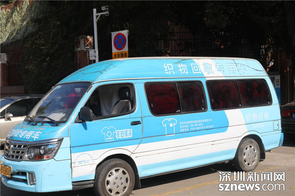 在福田區(qū)梅林一村的近停車場入口處,記者在幾乎要滿的織物回收箱前等待著該公司運(yùn)輸車輛的到來。不久后,一輛噴涂有織物回收專用車字樣的面包車進(jìn)入了停車場。據(jù)介紹,該車輛噴涂為政府統(tǒng)一要求,進(jìn)行廢舊織物回收的作業(yè)的車輛需要有統(tǒng)一的涂裝。