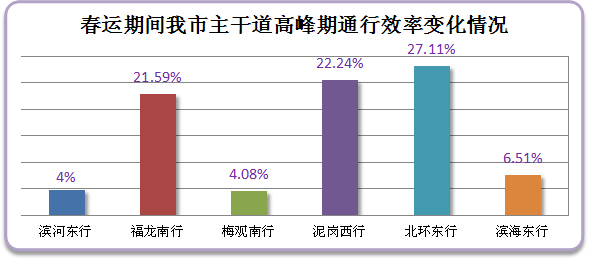 經(jīng)對我市城區(qū)主干道高峰期車流量監(jiān)測,預(yù)計春運(yùn)期間我市早晚高峰道路日趨順暢,全市各條主干道及進(jìn)出關(guān)道路平均通行效率提高一成,北環(huán)東行、泥崗路西行行車效率提升最為明顯。