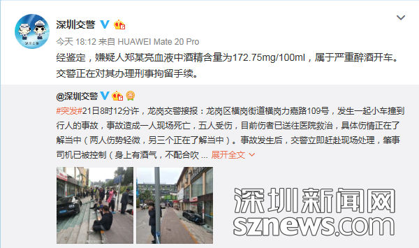 深圳新聞網(wǎng)1月21日訊(記者 王海婷)今日(1月21日)8時12分許,深圳龍崗區(qū)橫崗街道力嘉路109號,發(fā)生一起小車撞到行人的事故,事故造成一人現(xiàn)場死亡,五人受傷。經(jīng)鑒定,嫌疑人鄭某亮血液中酒精含量為172.75mg/100ml,屬于嚴重醉酒開車。交警正在對其辦理刑事拘留手續(xù)。