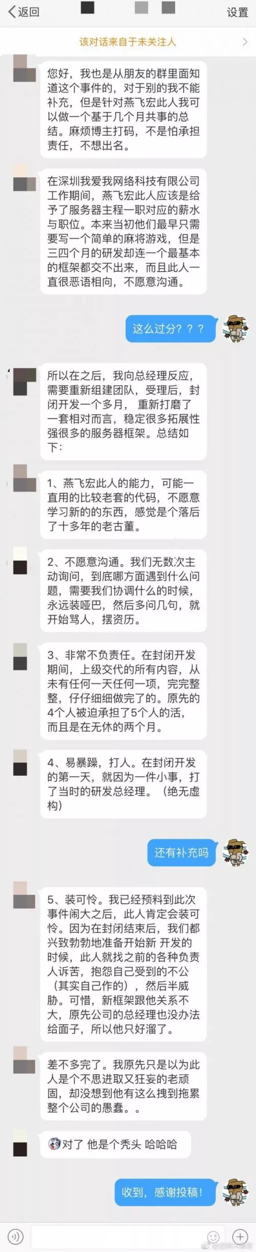 隨后,一位自稱是燕飛宏前同事的網(wǎng)友發(fā)文稱:之前的公司讓他做很簡單的游戲,但是他三四個月連框架都沒寫出來,業(yè)務能力只會用老套代碼,不愿意跟同事溝通,工作很不負責任、易暴躁、打人。