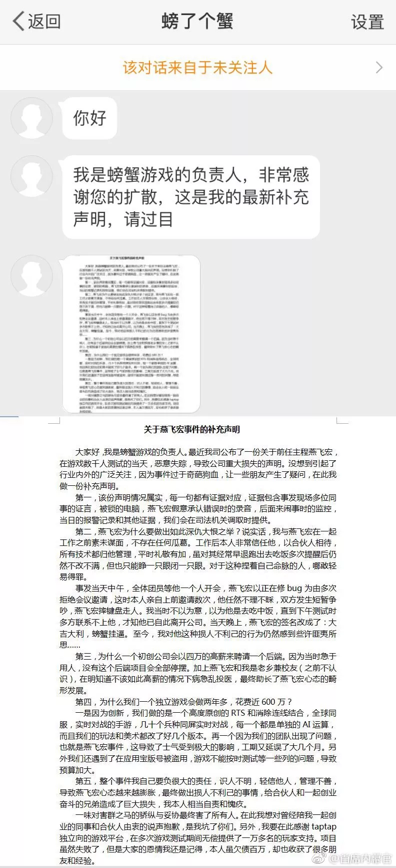 該微博一同曝光的還有一份“關于燕飛宏的補充聲明”,自稱是螃蟹游戲負責人的“螃了個蟹”表示,自己與燕飛宏在一起工作之前素未謀面,不存在任何瓜葛,工作后非常信任他,以合伙人相待,所有技術都歸他管理,因為捏著公司命脈,對其經(jīng)常早退也只能睜一只眼閉一只眼。