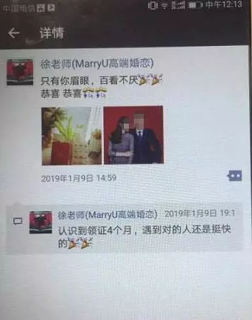 沒想到半個(gè)月之后,陳先生的朋友發(fā)現(xiàn),他的結(jié)婚照出現(xiàn)在了一個(gè)婚戀公司員工的朋友圈里。陳先生告訴記者,這個(gè)員工轉(zhuǎn)發(fā)他的照片同時(shí)還在上面評(píng)論寫上“認(rèn)識(shí)到領(lǐng)證四個(gè)月,遇到對(duì)的人還是挺快的”。