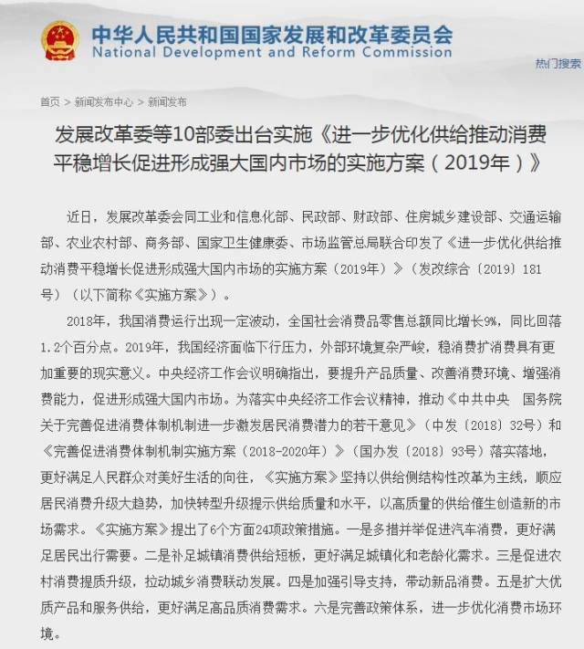 南方+2019年1月30日訊 1月29日,發(fā)改委等部門印發(fā)《進一步優(yōu)化供給推動消費平穩(wěn)增長促進形成強大國內(nèi)市場的實施方案 (2019年 ) 》(以下簡稱《方案》)。