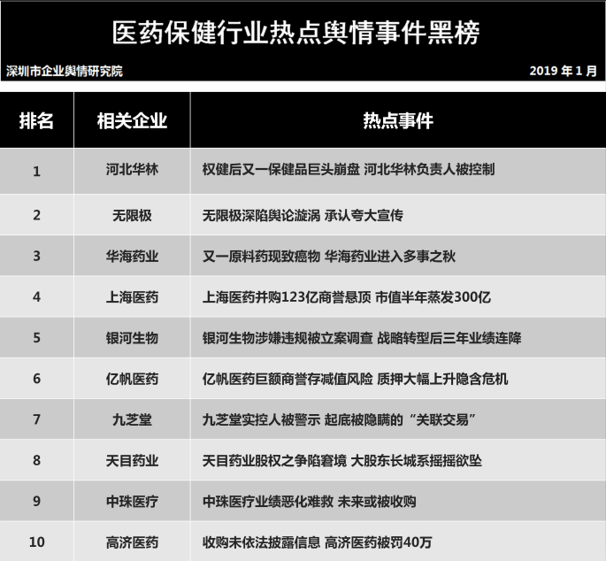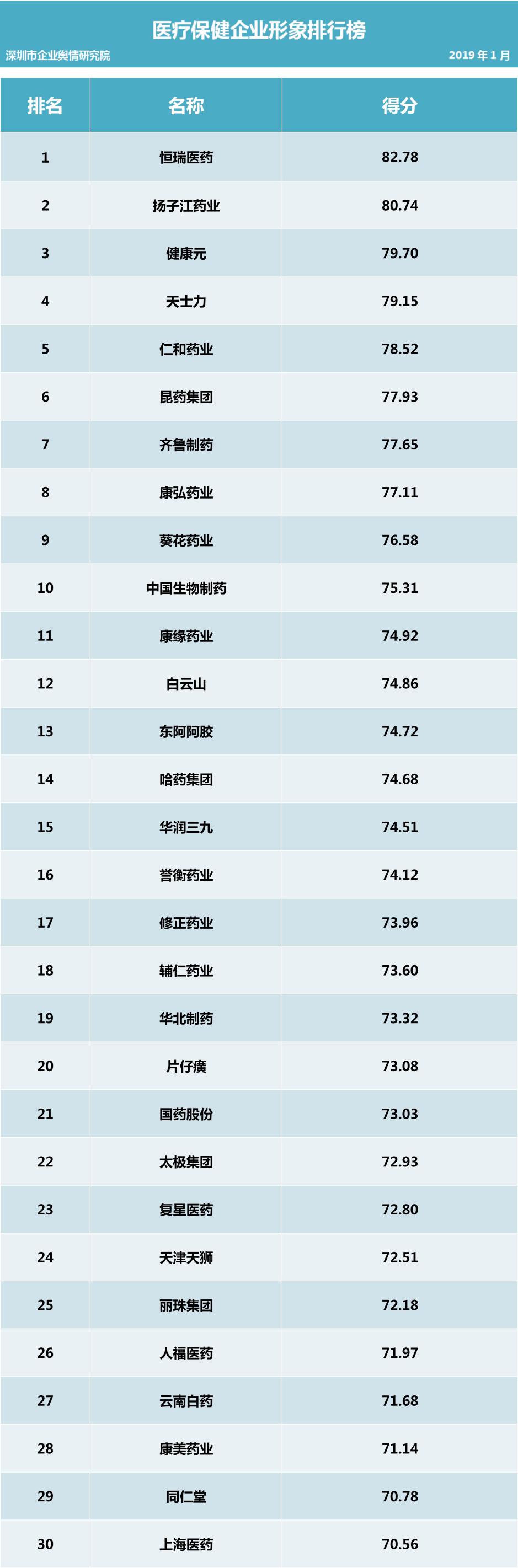 深圳新聞網2019年1月31日訊 (記者田志強 通訊員陳文光)1月31日,深圳企業(yè)輿情研究院發(fā)布第十二批企業(yè)輿情榜單。本次榜單重點聚焦房地產及醫(yī)藥保健兩個行業(yè)。醫(yī)藥保健行業(yè)輿情榜單由醫(yī)療保健行業(yè)熱點輿情事件排行榜(紅、黑榜)及醫(yī)藥保健行業(yè)企業(yè)公眾形象排行榜組成。